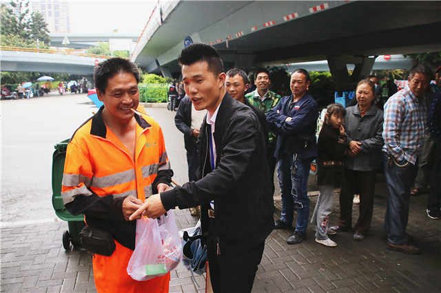 看着已经忙碌一两个小时的环卫工人吃上热乎乎的早餐,大家脸上都挂着会心的微笑。